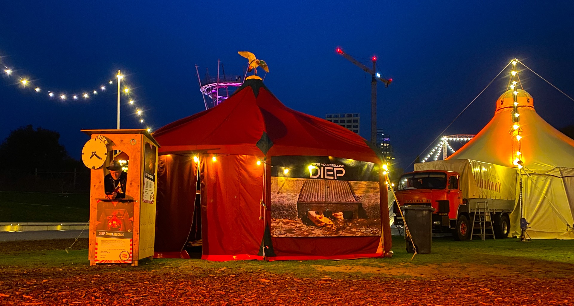 De voorstellingen DIEP, Fly en AF kan worden uitgevoerd in onze eigen 8 hoekige tent "de Woerd" met een diameter van 6 meter. De tent is ongeveer 3,5 meter hoog. Alle voorstellingen kunnen uiteraard ook gespeeld worden in een andere indoor setting die min of meer te verdonkeren is.